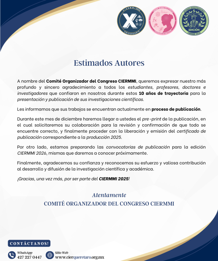 Los artículos aceptados serán publicados en Research Journals Internacionales científicos indexadas con registro ISSN, y ante el Registro Nacional de Instituciones y Empresas Científicas y Tecnológicas. RENIECYT – CONAHCYT